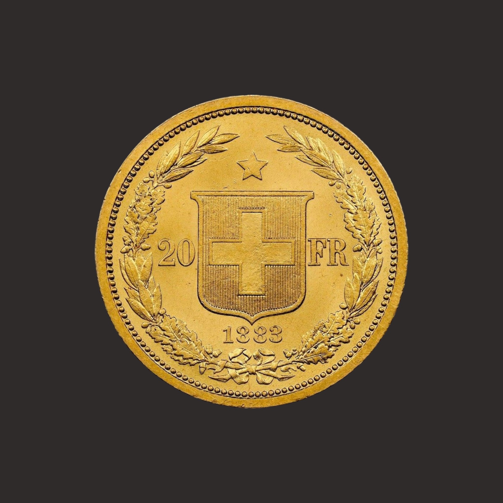 In anul 1883 a fost introdusa prima moneda de aur de 20 de franci, cu un design asemanator monedei de 5 franci de la acea vreme (dar cu un scut usor diferit pe revers si o personificare feminină diferita pe avers).In anul 1895, Consiliul Federal a decis ca moneda sa fie realizata cu un design nou. O noua reprezentare a Helvetiei a fost introdusa in anul 1897, cunoscuta sub numele de design Vreneli. Odata cu devalorizarea din anul 1936, valoarea intrinseca a monedelor de aur a crescut peste valoarea nominala a acestora; cu toate acestea, ele nu au fost niciodata demonetizate in mod oficial, chiar daca au fost efectiv retrase din circulatie dupa 27 septembrie 1936.