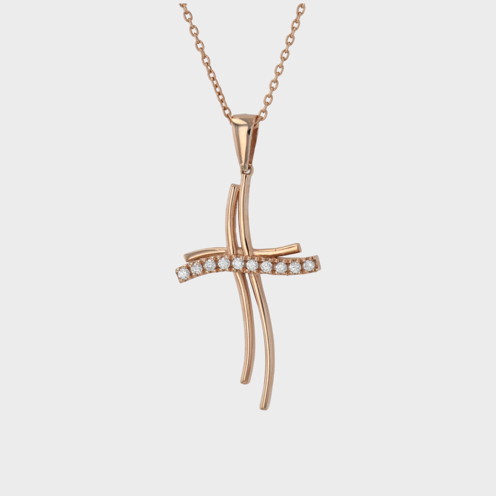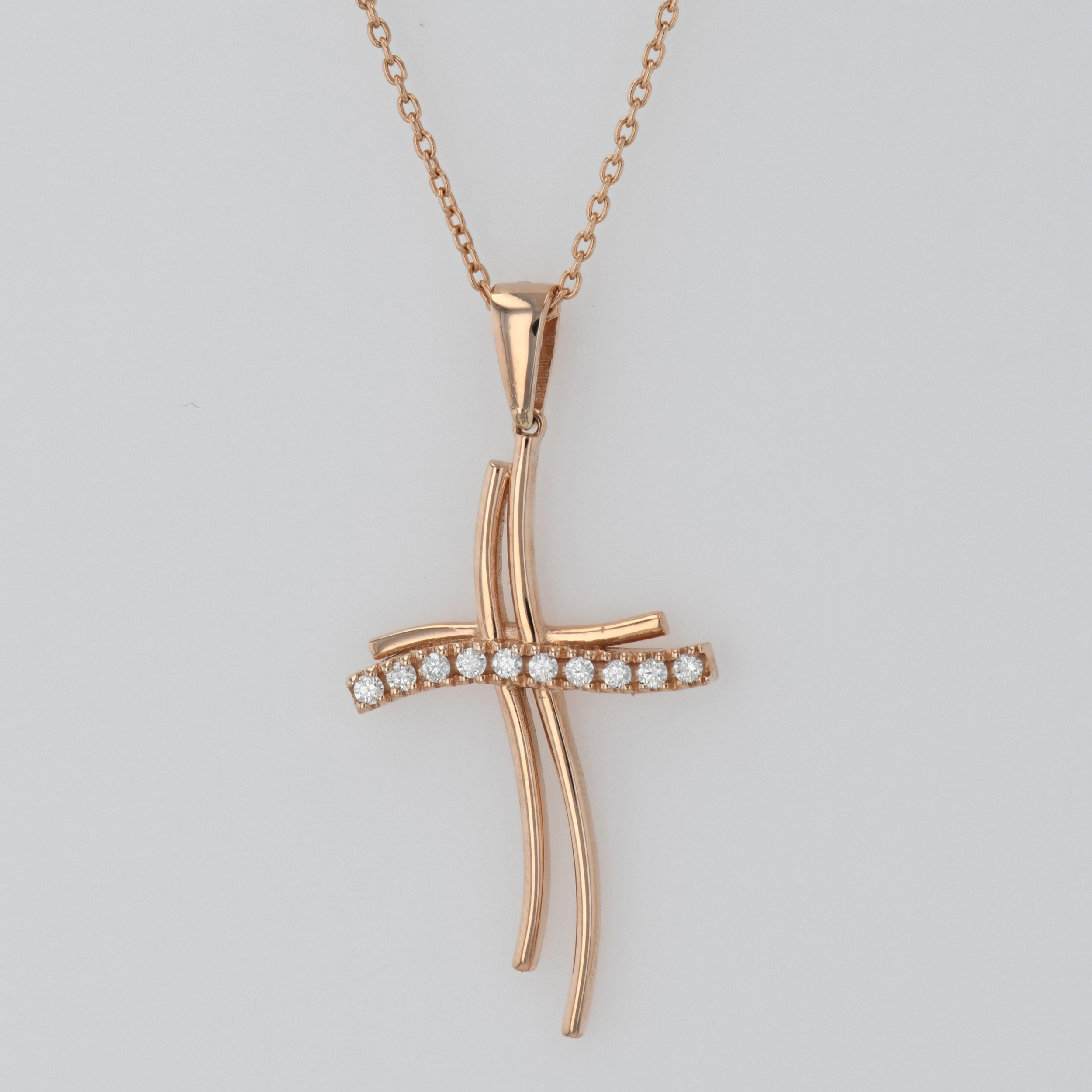 Pandantiv cruce 2,73 grame aur roz 18k, diamante ~ 0,13 ct.(10 bucati), culoare F – G, claritate VS, taietura briliant, dimensiune ~ 3,6 x 1,8 cm. Lantul nu este inclus in gramaj si pret.
