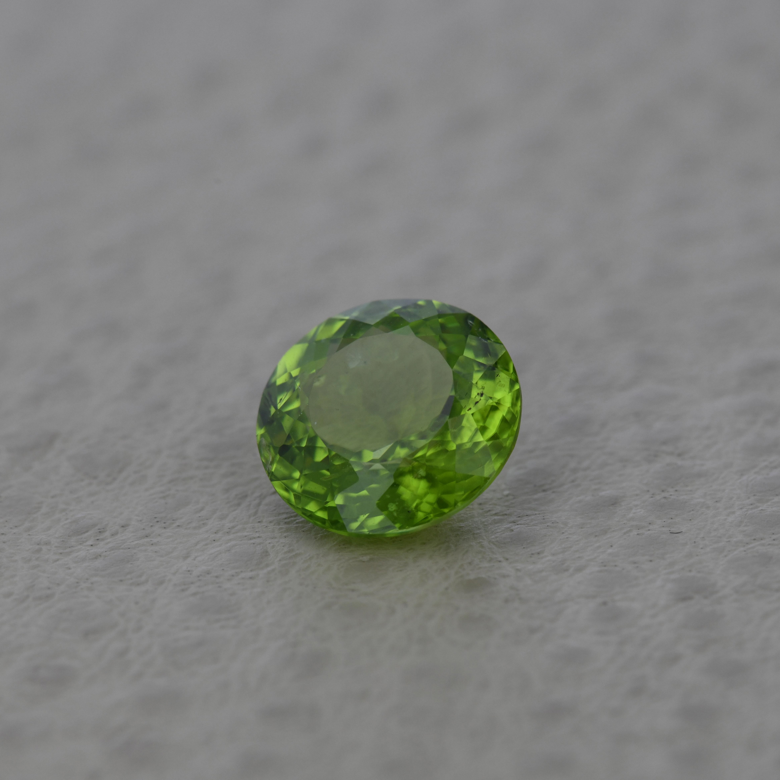 Peridot 6,71 ct., neincalzit, culoare verde-galbui intens, forma rotunda, taietura mixta, transparent, specie olivin natural, certificare ALGT Antwerp nr. 23743239, dimensiune 12,06 – 12,18 x 6,60 mm.