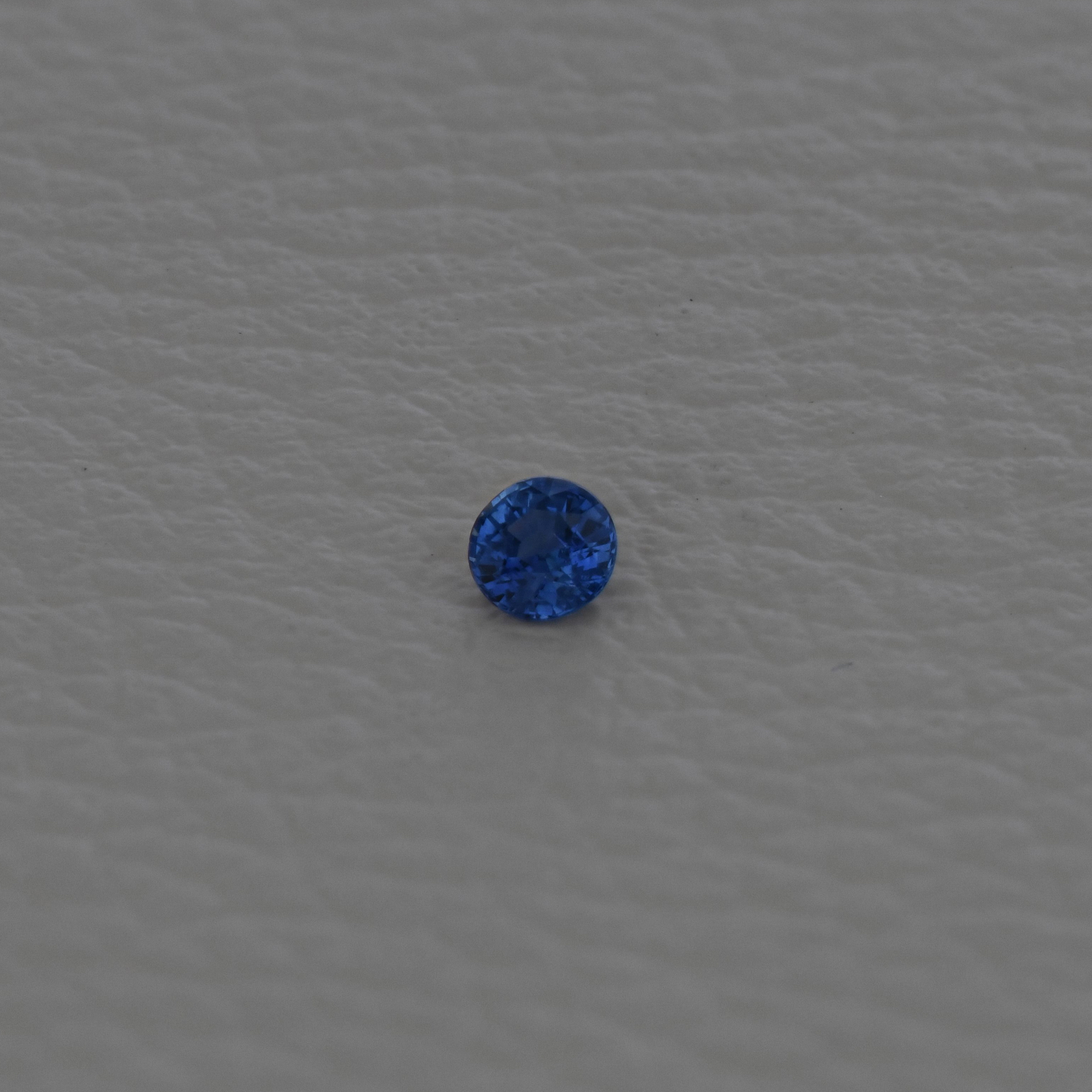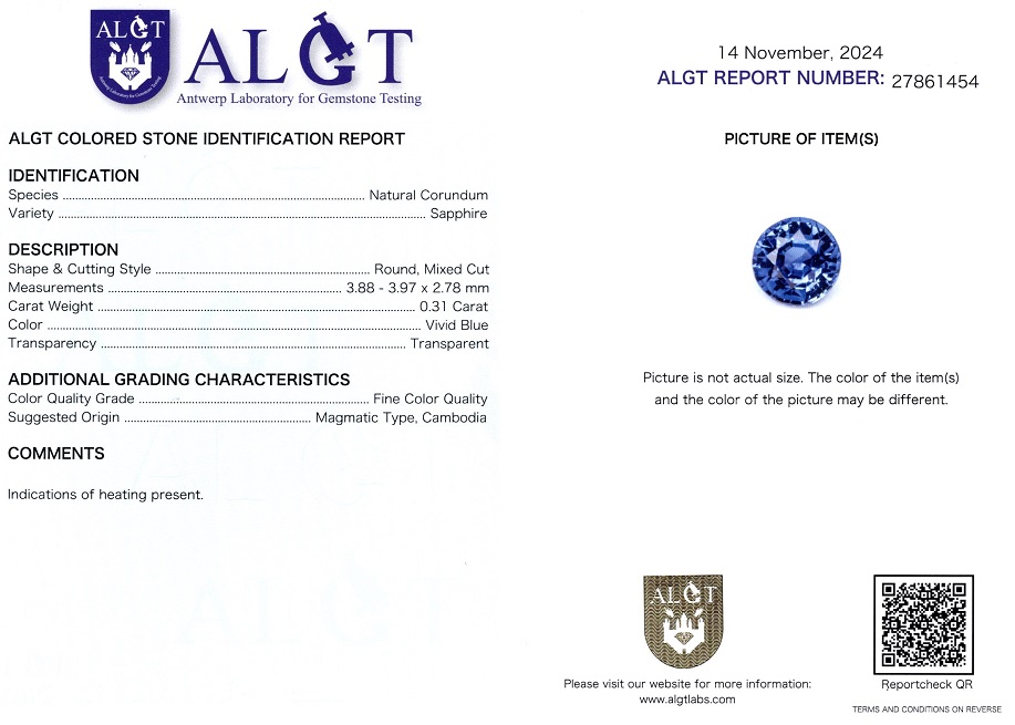 Safir 0,31 ct., Magmatic, Cambodia, Fine Color Quality, culoare albastru deschis, forma rotunda, taietura mixta, transparent, specie corindon natural, dimensiune 3,88 – 3,97 x 2,78 mm, certificare ALGT Antwerp nr. 27861454.