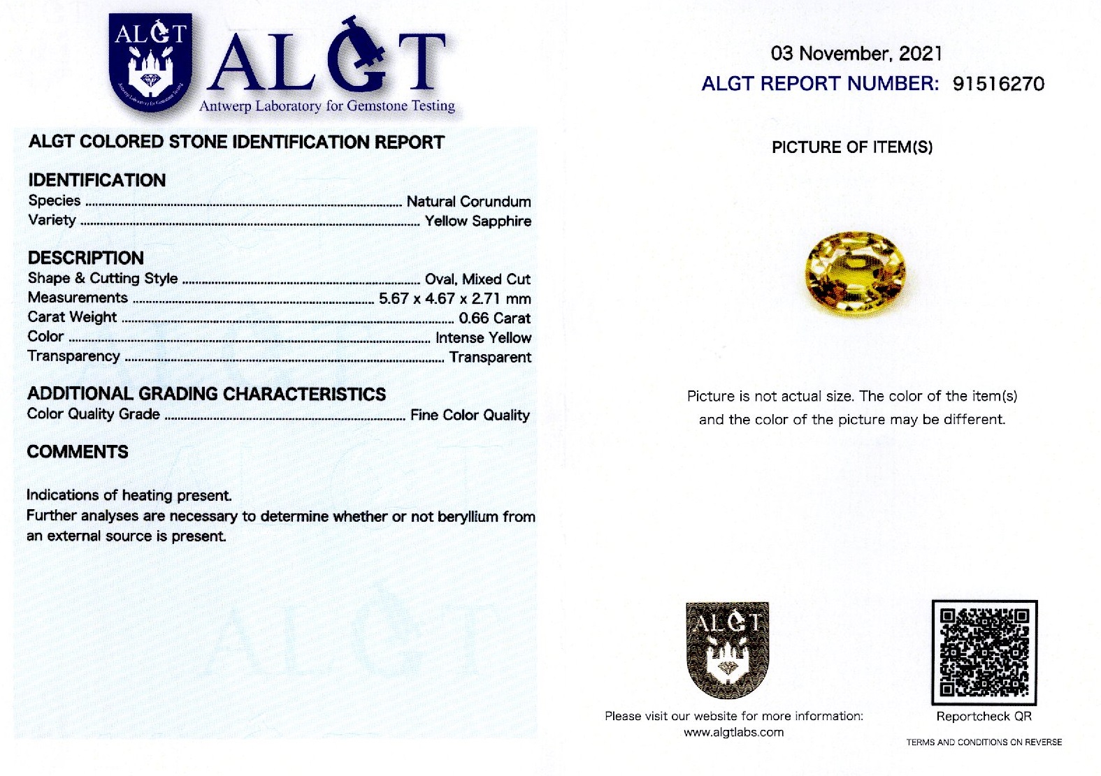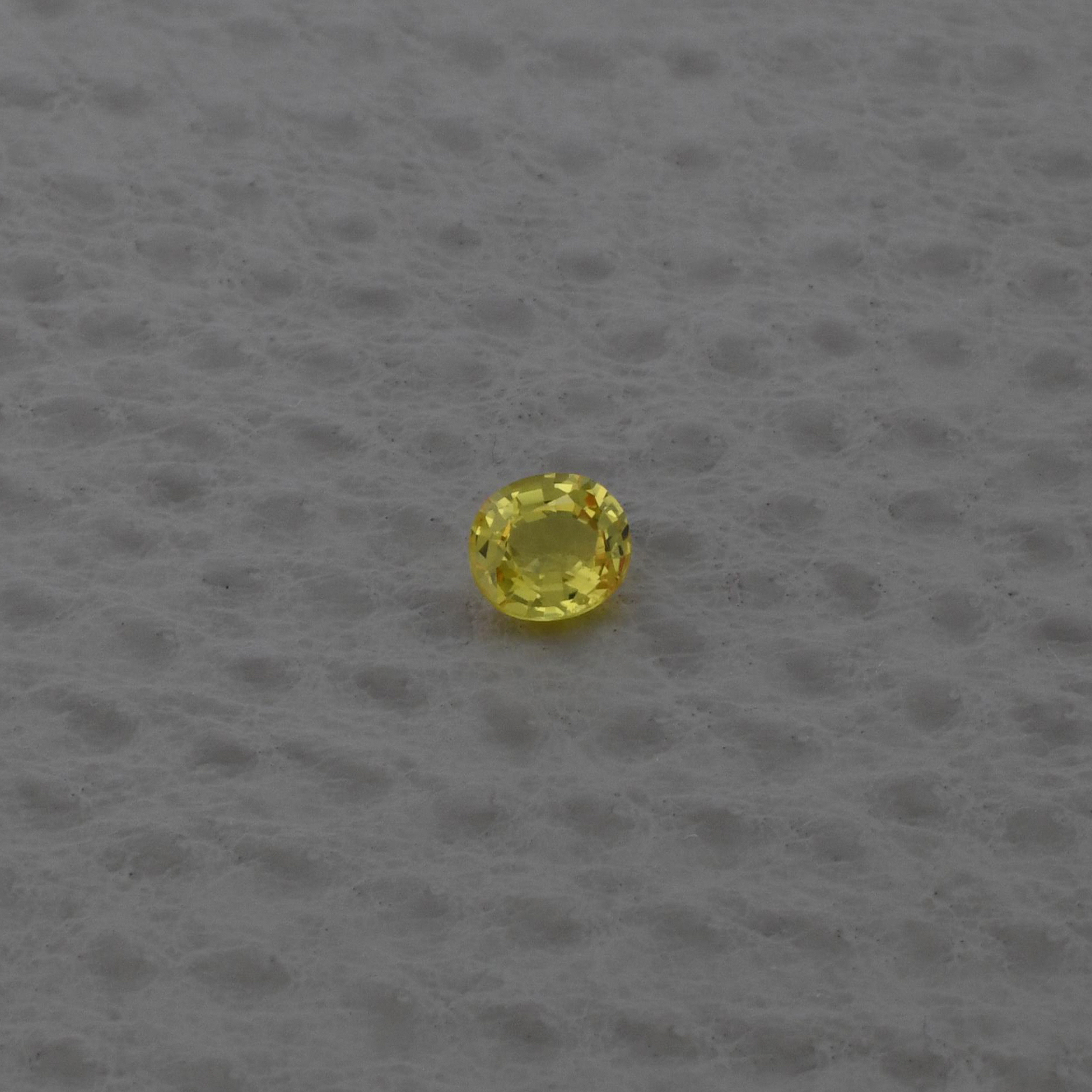 Safir 0,66 ct., culoare galben intens(Fine Color Quality), forma ovala, taietura mixta, transparent, specie corindon natural, certificare ALGT Antwerp nr. 91516270, dimensiuni 5,67 x 4,67 x 2,71 mm.