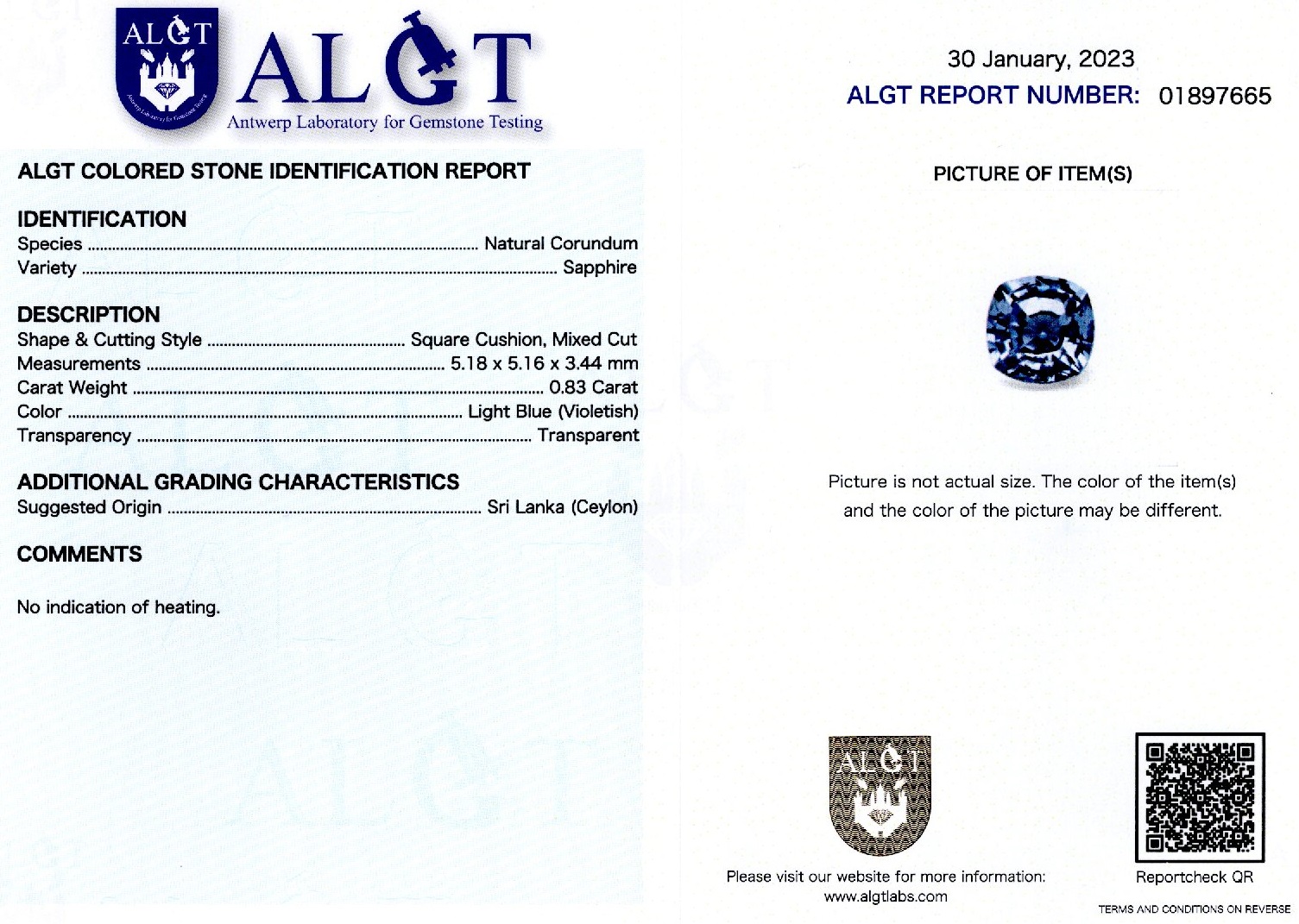 Safir 0,83 ct., Sri Lanka(Ceylon), neincalzit, culoare albastru violet, forma cushion, taietura mixta, transparent, specie corindon natural, certificare ALGT Antwerp nr. 01897665, dimensiune 5,18 x 5,16 x 3,44 mm.