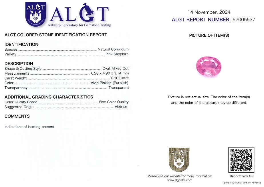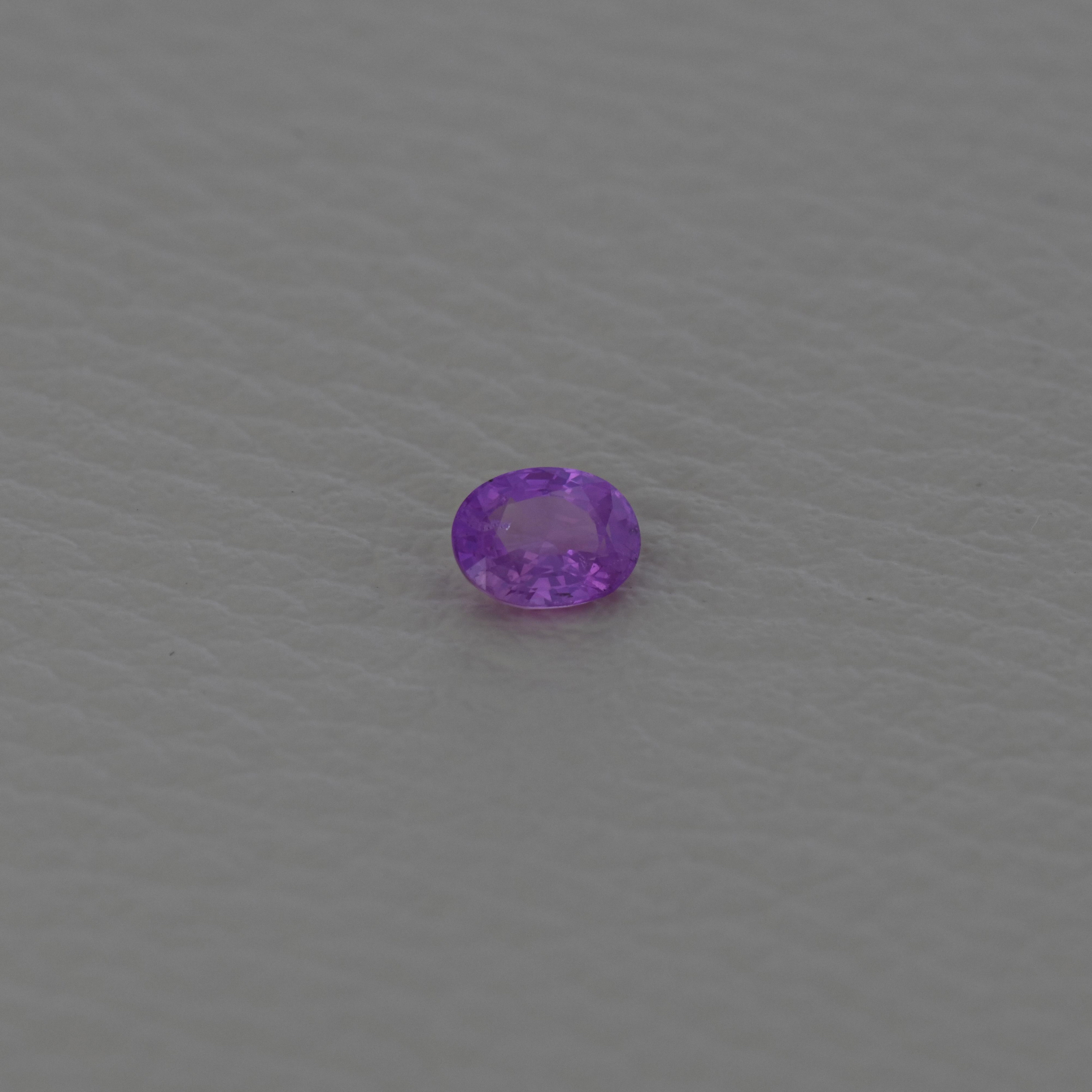 Safir 0,90 ct., Vietnam, Fine Color Quality, culoare roz purpuriu, forma ovala, taietura mixta, transparent, specie corindon natural, dimensiune 6,28 x 4,90 x 3,14 mm, certificare ALGT Antwerp nr. 52005537.