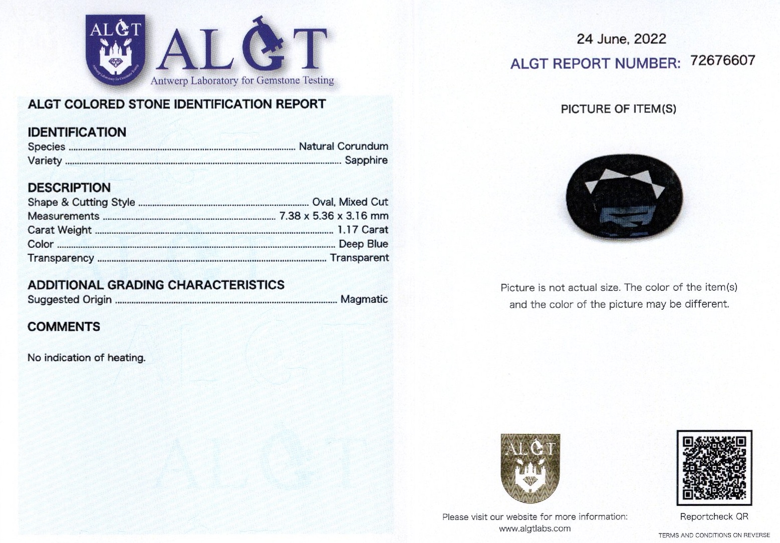Safir 1,17 ct., Magmatic, neincalzit, culoare albastru inchis, forma ovala, taietura mixta, transparent, specie corindon natural, certificare ALGT Antwerp nr. 72676607, dimensiune 7,38 x 5,36 x 3,16 mm.