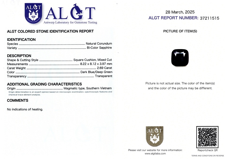 Safir 2,69 ct., Magmatic, Vietnam, neincalzit, culoare albastru verzui, forma cushion patrat, taietura mixta, transparent, specie corindon natural(Bi-Color Sapphire), dimensiune 8,22 x 8,12 x 3,97 mm, certificare ALGT Antwerp nr. 37211515.