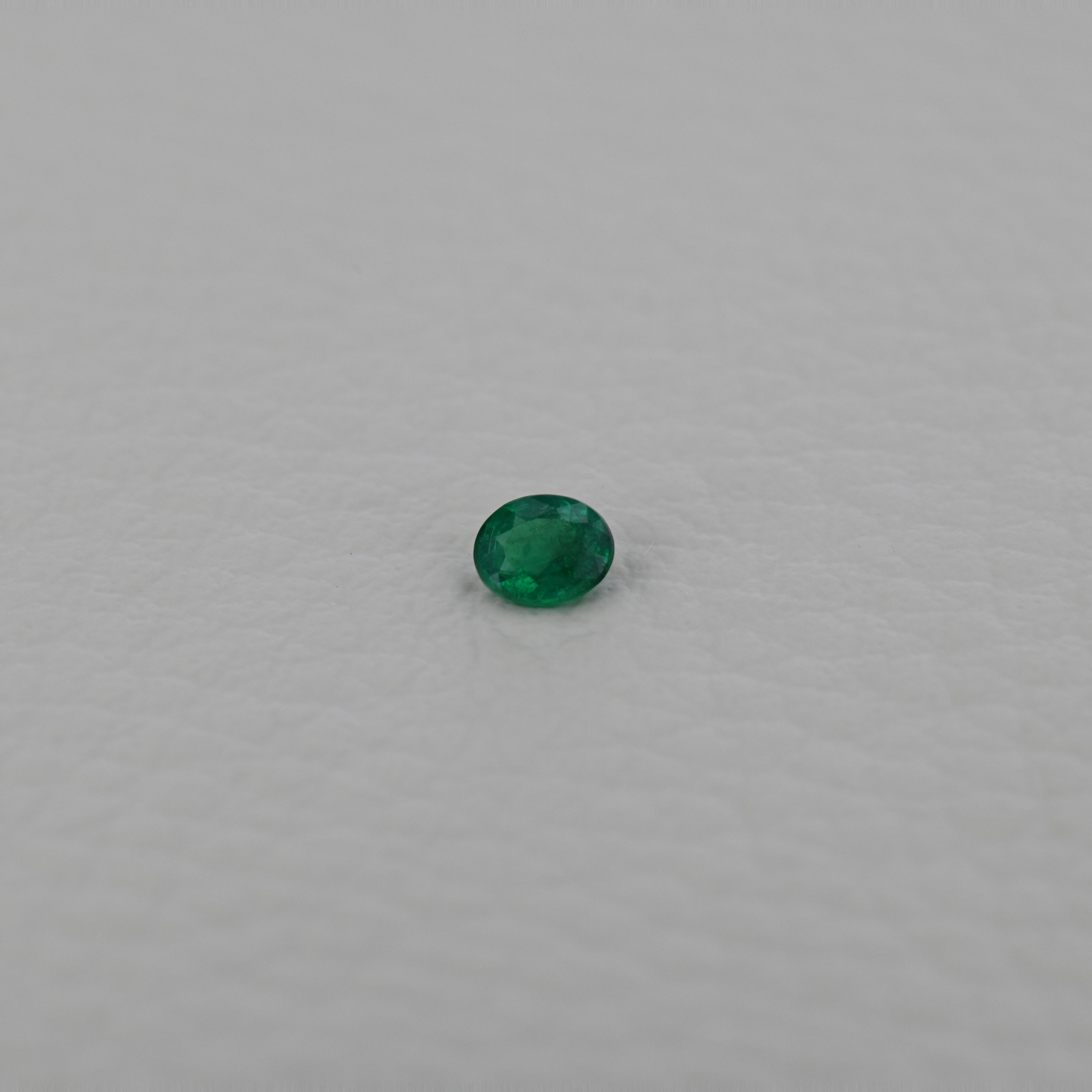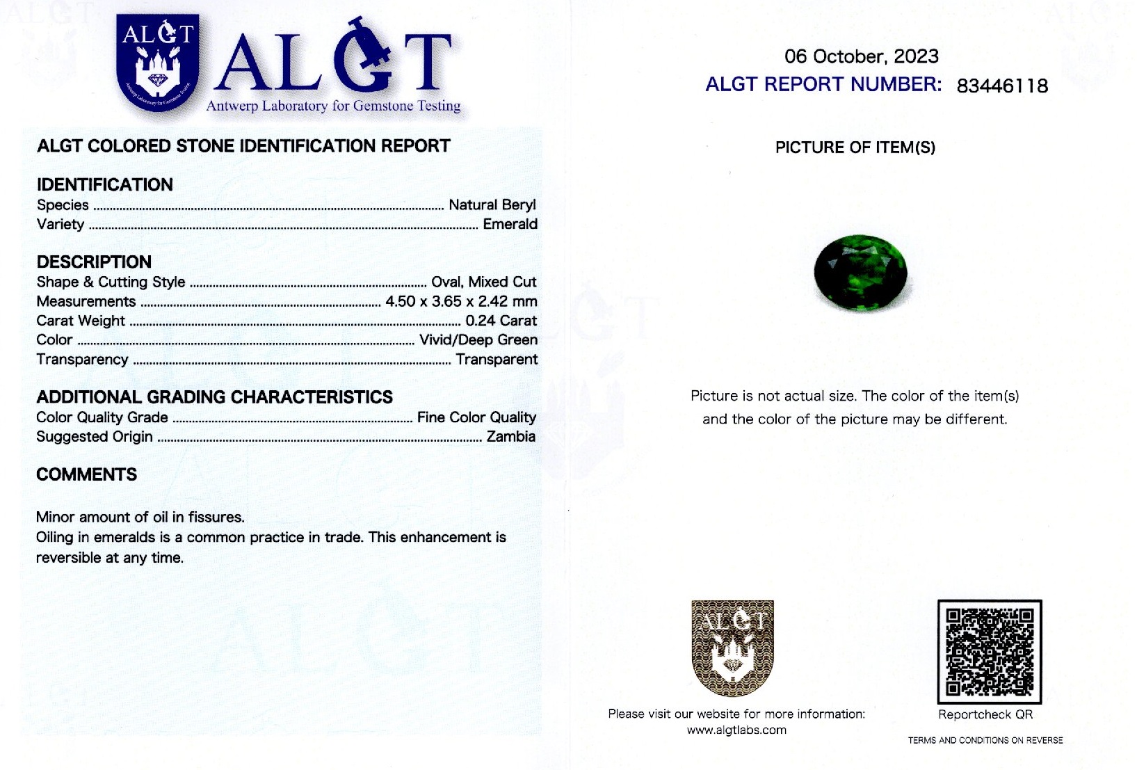 Smarald 0,24 ct., Zambia, culoare verde intens(fine color quality), forma ovala, taietura mixta, transparent, specie beril natural, certificare ALGT Antwerp nr. 83446118, dimensiune 4,50 x 3,65 x 2,42 mm.