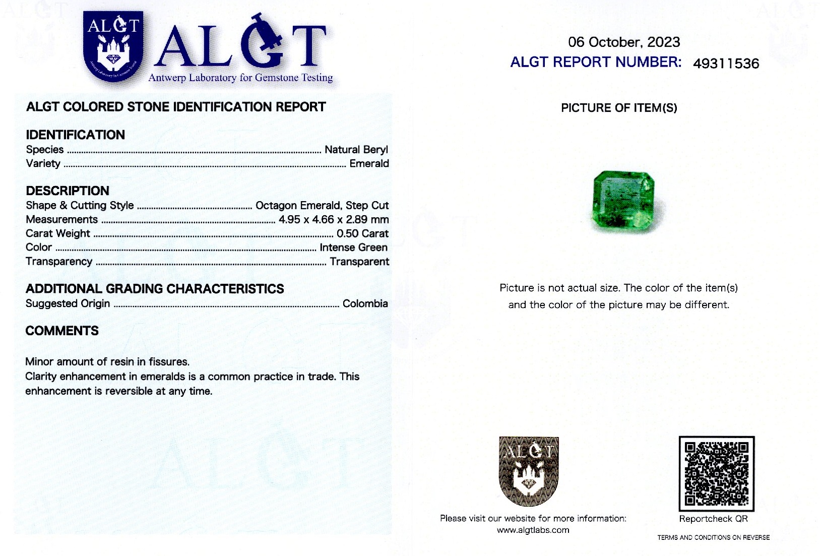 Smarald 0,50 ct., Columbia, ALGT Antwerp