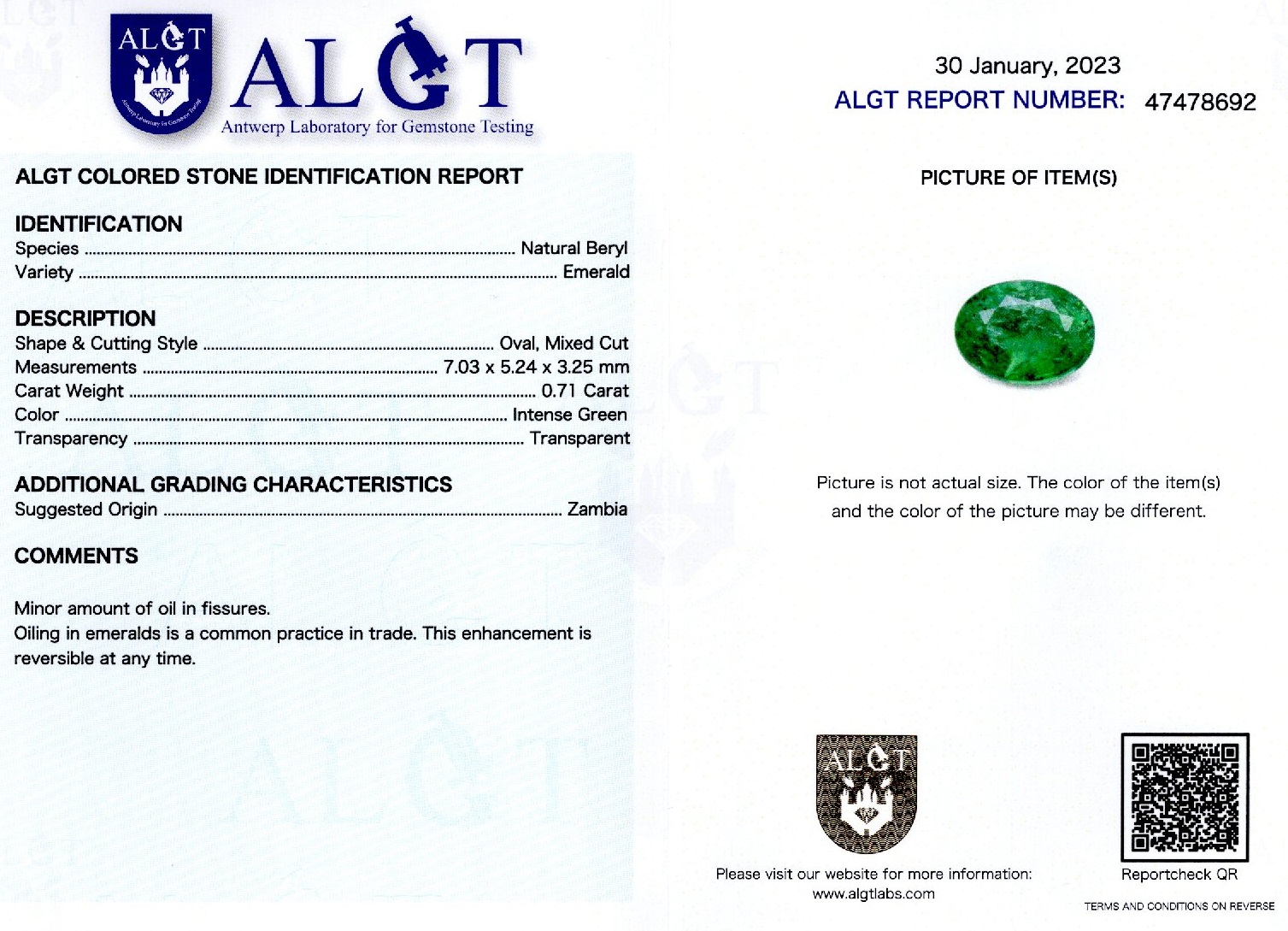Smarald 0,71 ct., Zambia, culoare verde intens, forma ovala, taietura mixta, transparent, specie beril natural, certificare ALGT Antwerp nr. 47478692, dimensiune 7,03 x 5,24 x 3,25 mm.