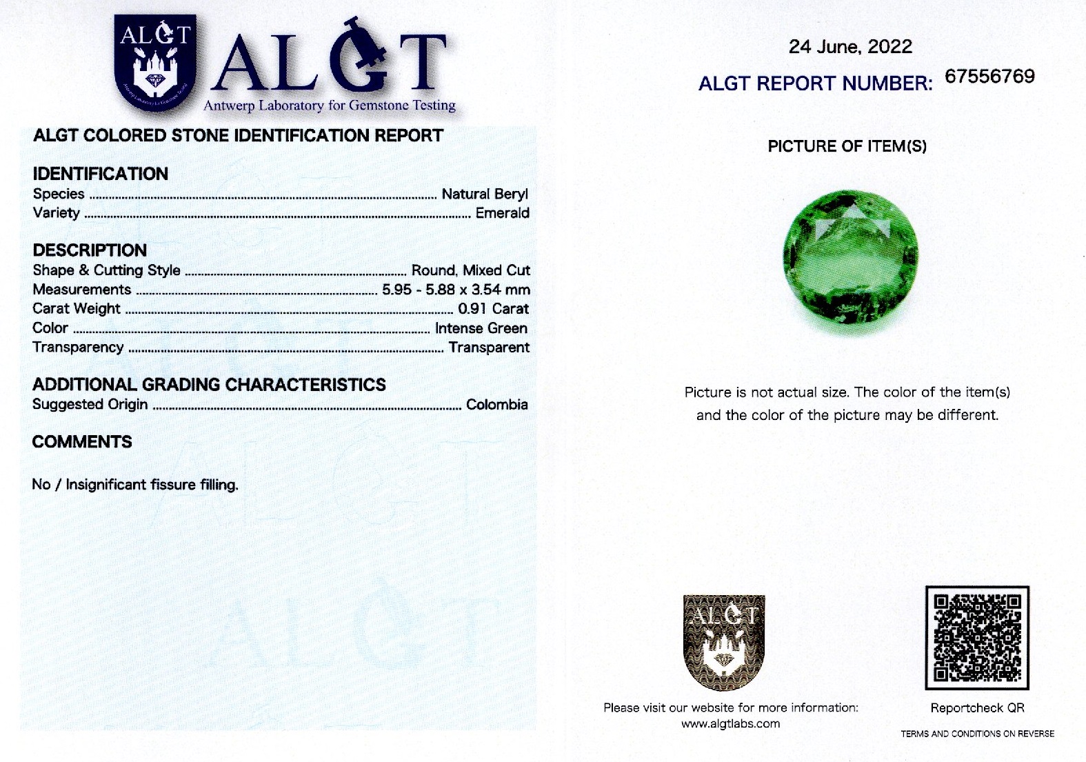 Smarald 0,91 ct., Columbia, culoare verde intens, forma rotunda, taietura mixta, transparent, specie beril natural, certificare ALGT Antwerp nr. 67556769, dimensiune 5,95 – 5,88 x 3,54 mm.