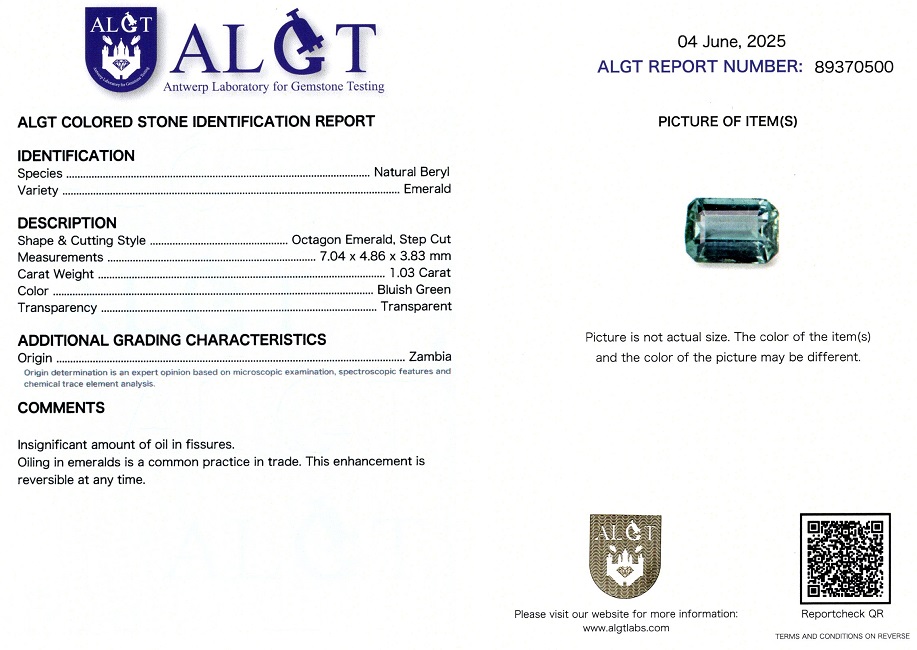 Smarald 1,03 ct., Zambia, certificare ALGT Antwerp