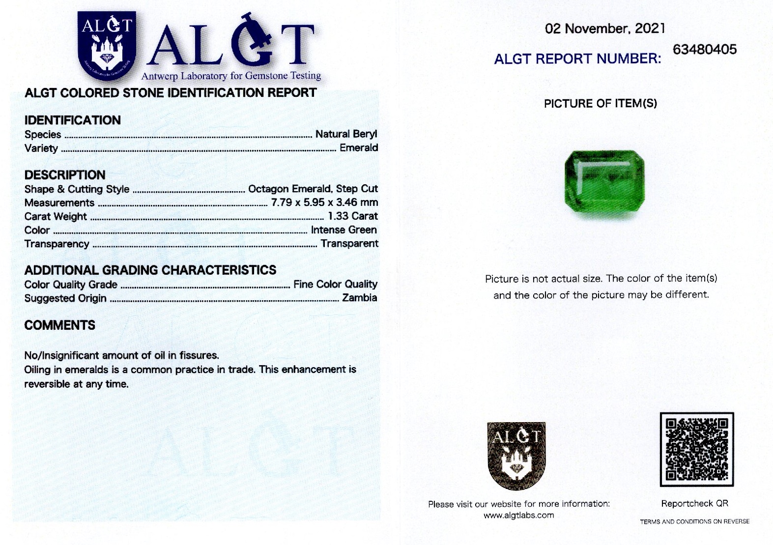 Smarald 1,33 ct., Zambia, culoare verde intens(Fine Color Quality), forma octogonala, taietura in trepte, transparent, specie beril natural, certificare ALGT Antwerp nr. 63480405, dimensiuni 7,79 x 5,95 x 3,46 mm.