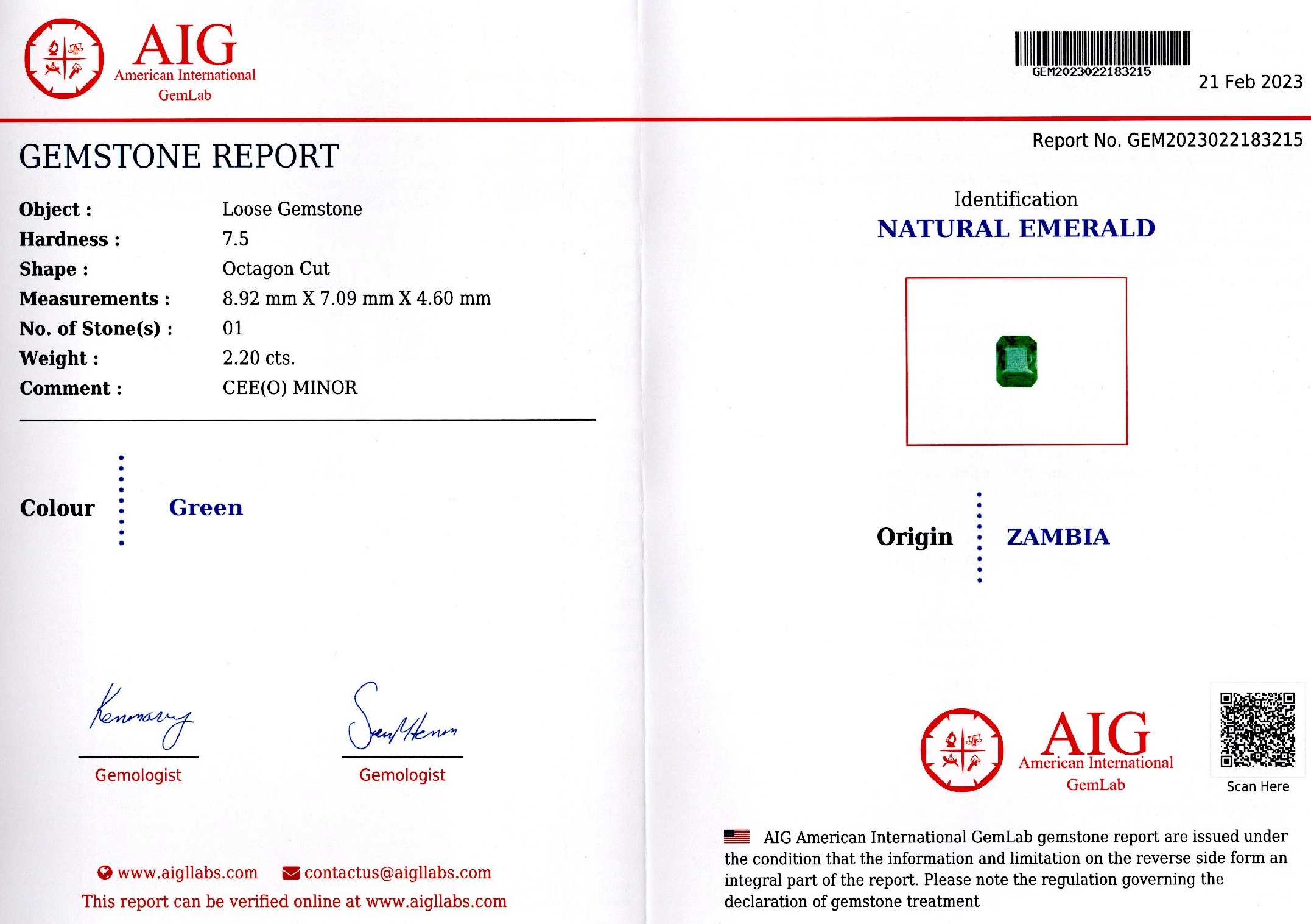 Smarald 2,20 ct., Zambia, certificare AIG