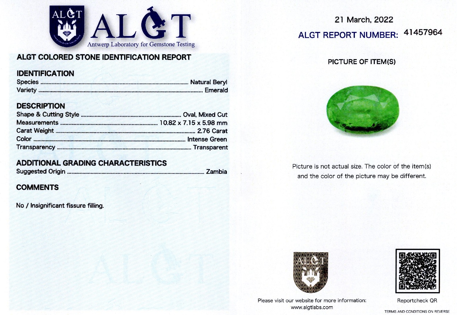 Smarald 2,76 ct., Zambia, culoare verde intens, forma oval, taietura mixta, transparent, specie beril natural, certificare ALGT Antwerp nr. 41457964, dimensiune 10,82 x 7,15 x 5,98 mm.