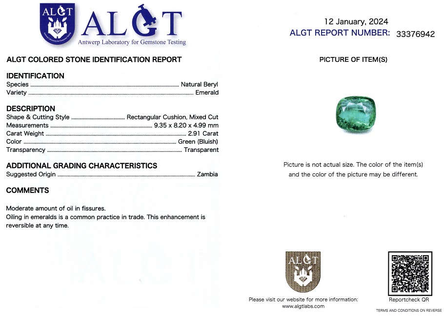 Smarald 2,91 ct., Zambia, culoare verde albastrui, forma cushion, taietura mixta, transparent, specie beril natural, certificare ALGT Antwerp nr. 33376942, dimensiune 9,35 x 8,20 x 4,99 mm.