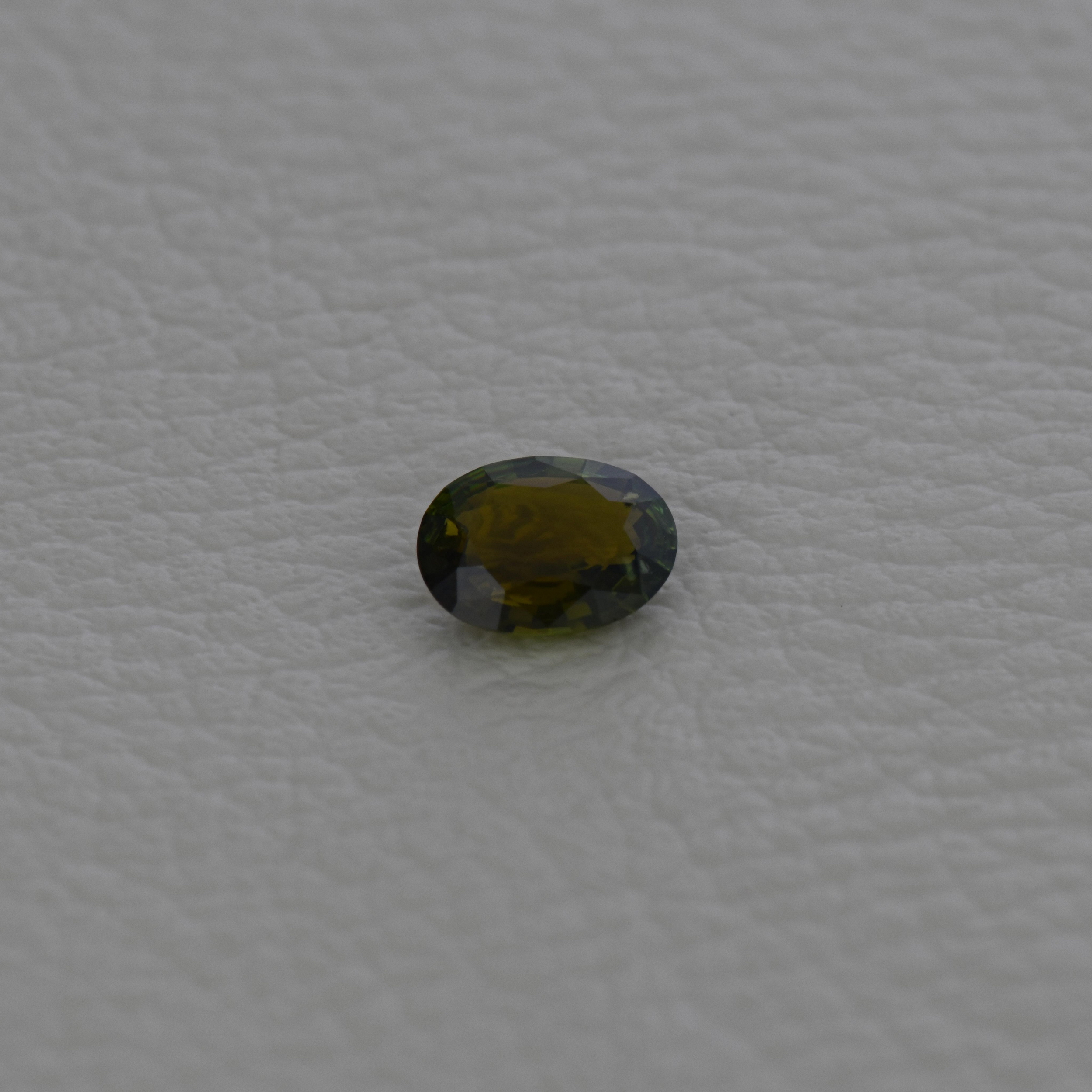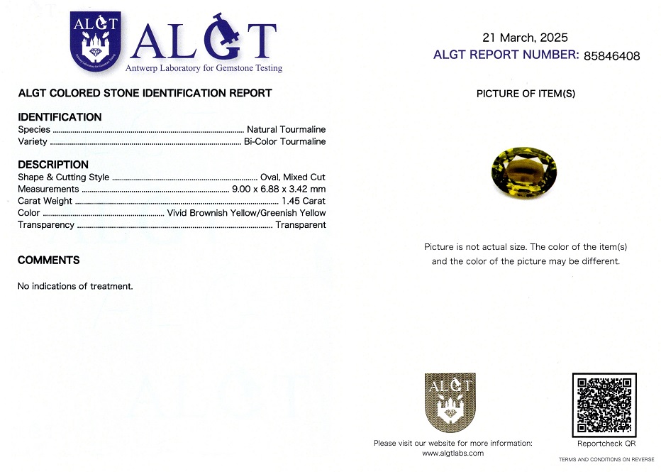 Turmalin 1,45 ct., neincalzit, culoare galben maroniu/verzui, forma ovala, taietura mixta, transparent, specie turmalin natural(Bi-Color Turmalin), dimensiune 9,00 x 6,88 x 3,42 mm, certificare ALGT Antwerp nr. 85846408.
